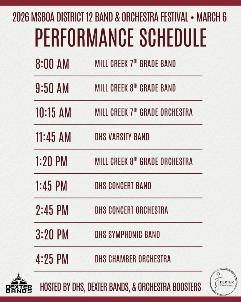 The Dexter Bands are comprised of all 5th – 12th grade bands in Dexter Community Schools Dexter is hosting! Support the directors and Band and Orchestra Boosters by signing up to help here!