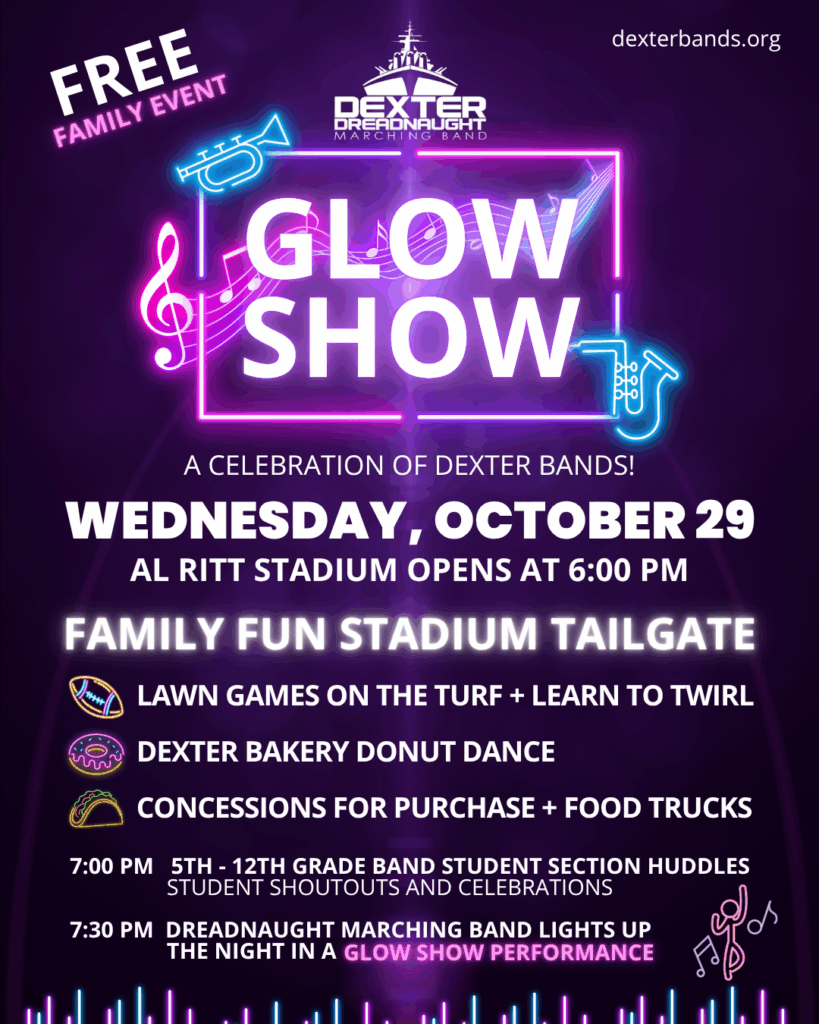 All are invited to this annual exciting event celebrating Dexter Bands on Wednesday, October 29 at Al Ritt Stadium in Dexter, Michigan. Gates will open at 6:00 PM for the Family Fun Stadium Tailgate! Concessions and food truck delights will be available for purchase. There is no cost for admission and guests will have the opportunity to support Dexter Bands by donating by cash, check, credit card and Apple/Google pay.